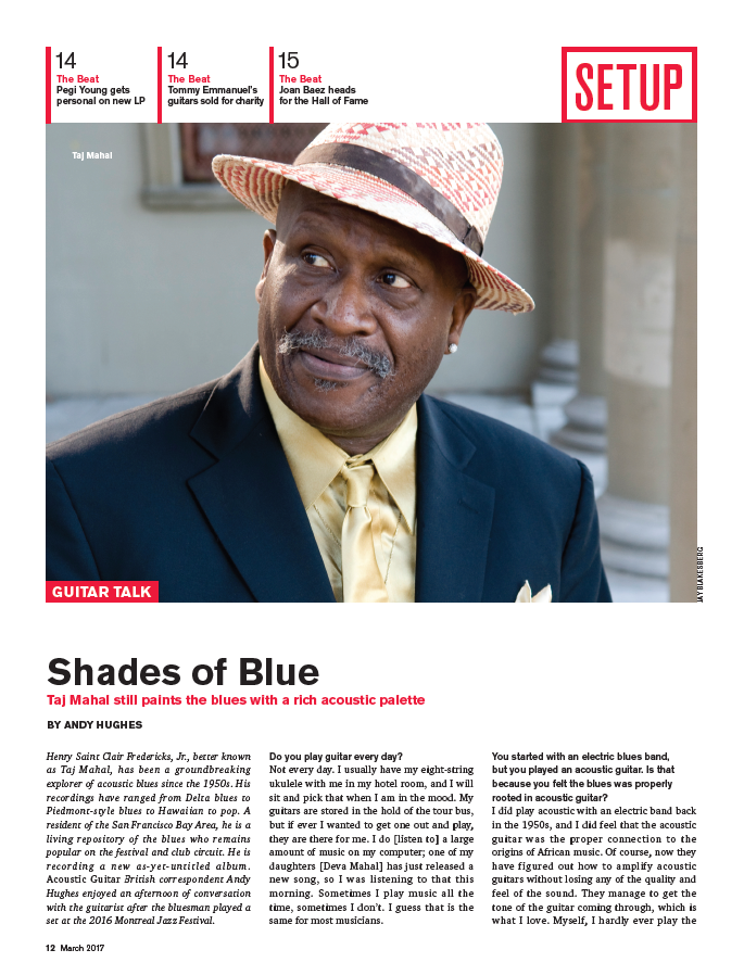 Features: Three generations of guitar-making at Guitarras Zepeda; Taj Mahal talks about his favorite guitars; Tommy Emmanuel sells guitars for charity; Janis Ian donates rare D’Aquisto to D’Addario Foundation; Joan Baez to be inducted into Rock & Roll Hall of Fame.