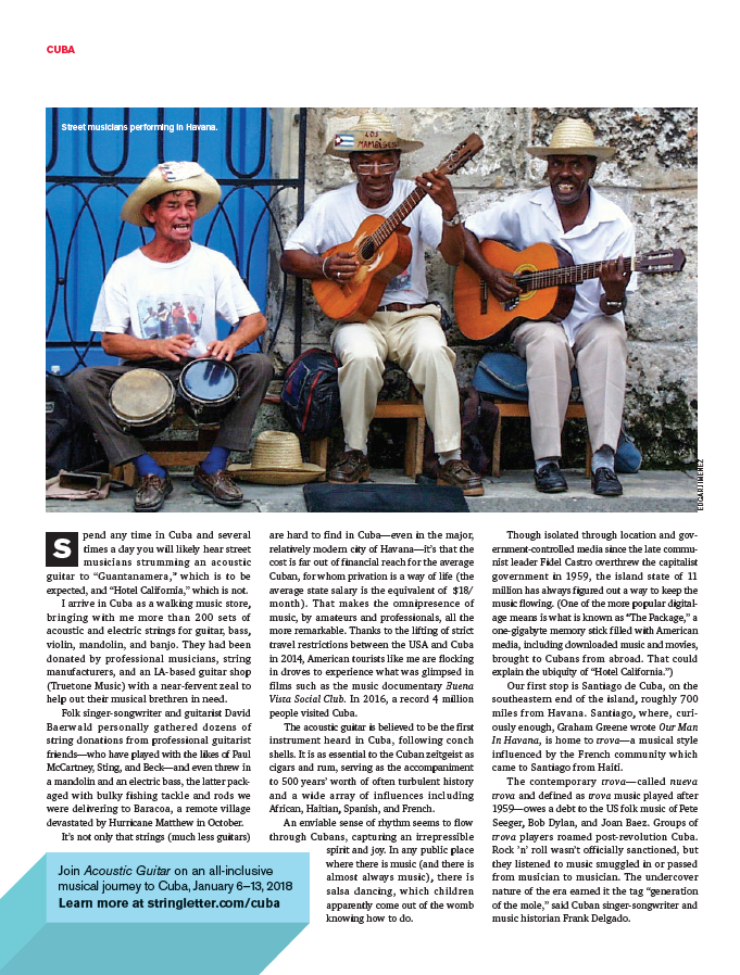 Features: A letter from Cuba describes a journey across the Caribbean island where acoustic guitar music is omnipresent; inside the classical guitar orchestras craze and its unlikely epicenter, Arizona.