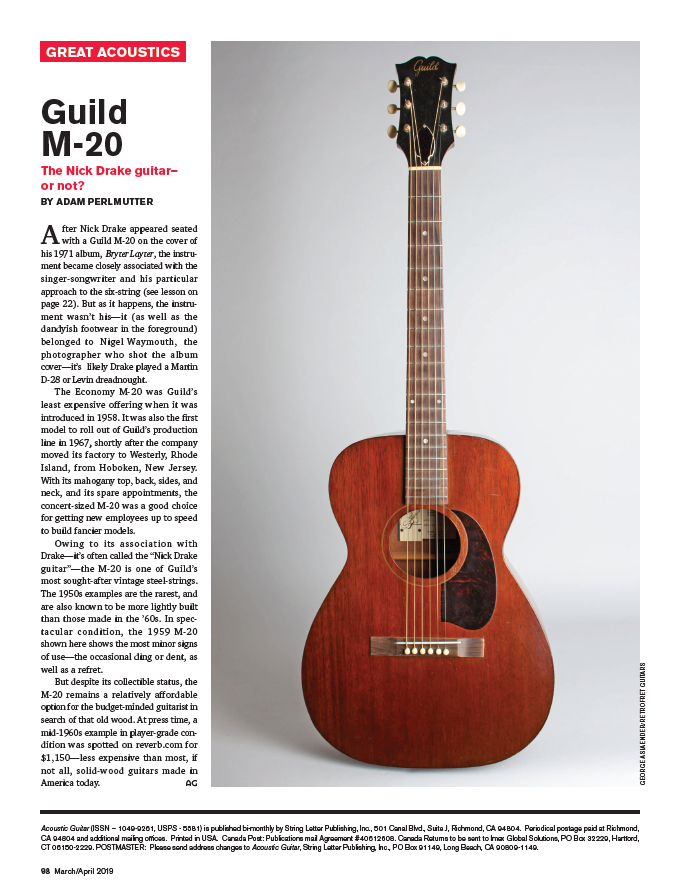 Features: Eric Skye discusses his Santa Cruz signature model; inside Nick Drake’s idiosyncratic guitar style; Recording and Marketing Yourself: A primer on capturing and sharing your music in the digital age; Jim D’Addario on his family’s string-making legacy; Great Acoustics: The Guild M-20 “Nick Drake” guitar; and more
