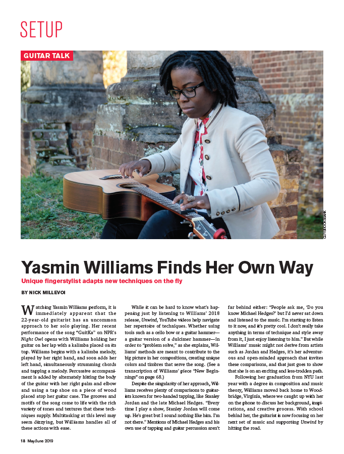 Features: Yasmin Williams. The 22-year-old Northern Virginia-based guitarist talks about her unorthodox approach to the instrument, as well as the tools of her trade; Choosing and Using Capos. A close-up look at capos and how they work, and the factors to consider when choosing one; Vintage guitar guru George Gruhn talks shop.