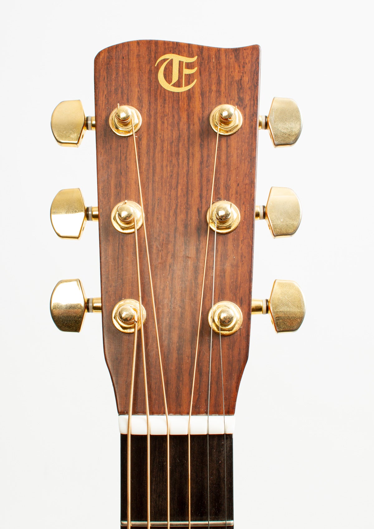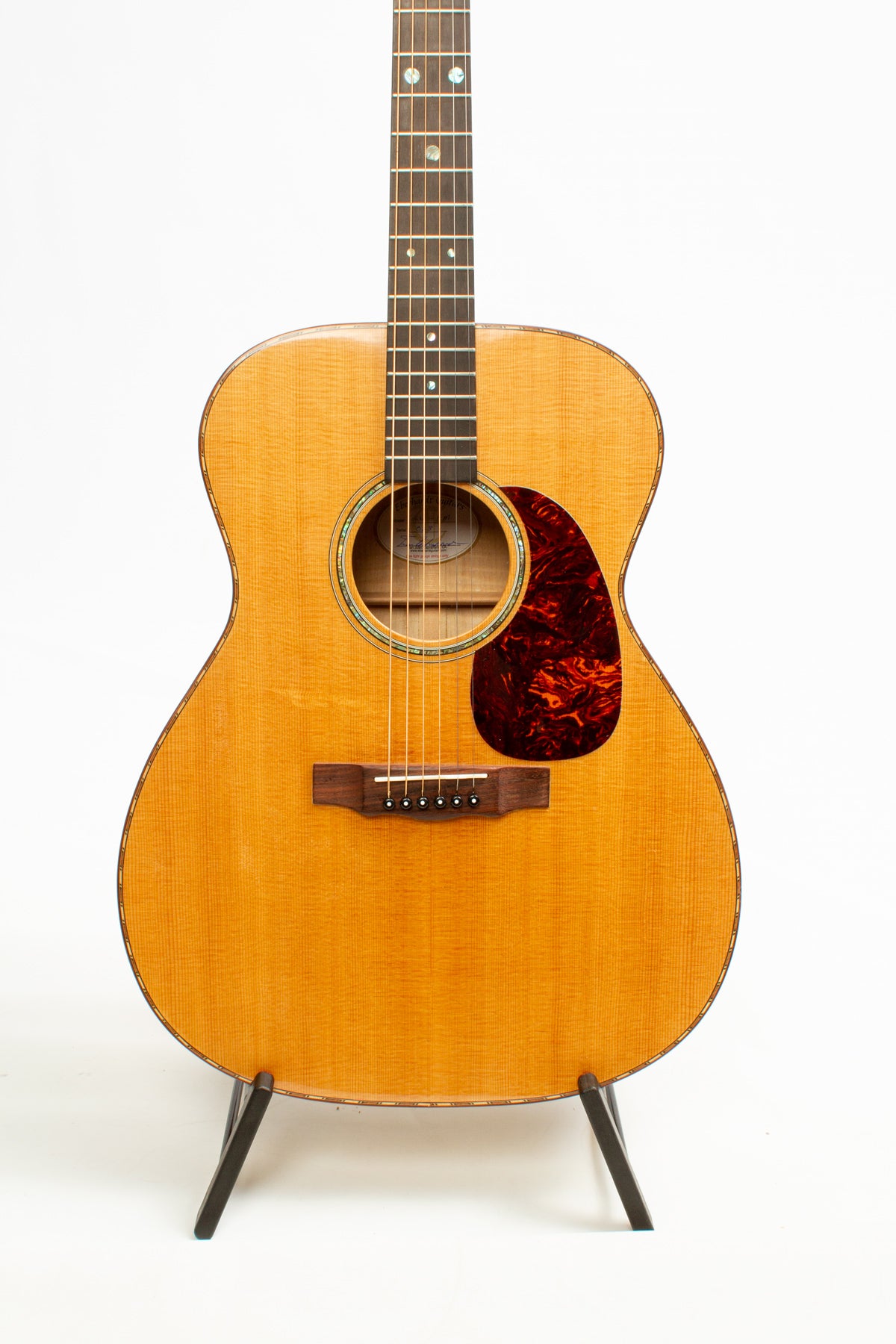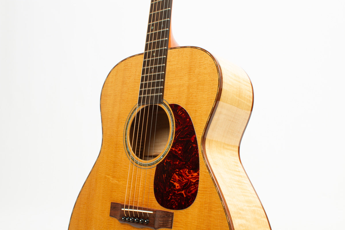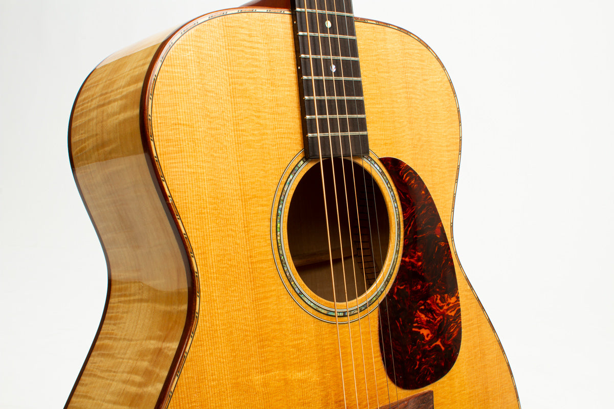 Like many luthiers, Tim Eberhardt started as a guitarist and then caught the building bug. Based in San Juan Capistrano, California, Eberhardt offers several models; this Jumbo pairs pale flamed maple with Sitka spruce to produce a big, complex sound. Est. $2,000–$2,500