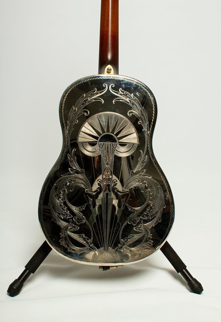 Style 4 is the top-of-the-line National Tricone, with a base price of $10,000 without any custom components. This guitar, featuring a custom Art Deco–inspired engraving by metalsmith David Giulietti, was commissioned by Paul Mehling, founder of the renowned Hot Club of San Francisco.