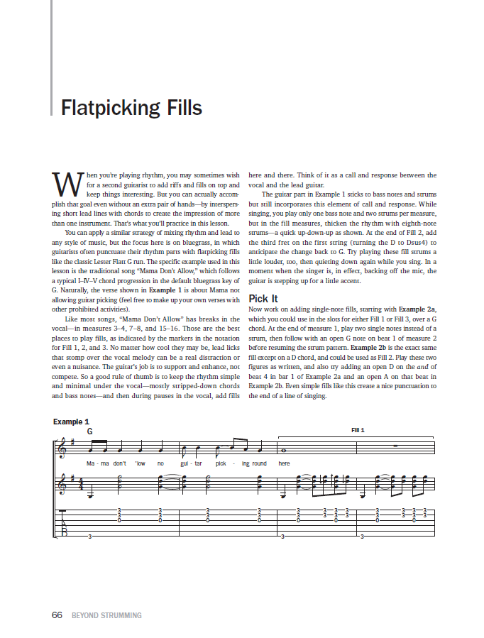 Beyond Strumming is the ultimate guide for any guitarist who wants to go beyond playing the same patterns in song after song, and create accompaniment parts that are more dynamic and distinctive. Jeffrey Pepper Rodgers, the founding editor of Acoustic Guitar magazine and a grand prize winner of the John Lennon Songwriting Contest, shares the secrets of effective accompaniment in any style. Through 20 easy-to-follow lessons, you’ll expand your accompaniment toolkit so you can create fresh and varied guitar parts that make the songs shine. Each lesson includes standard notation, tablature, and video examples.