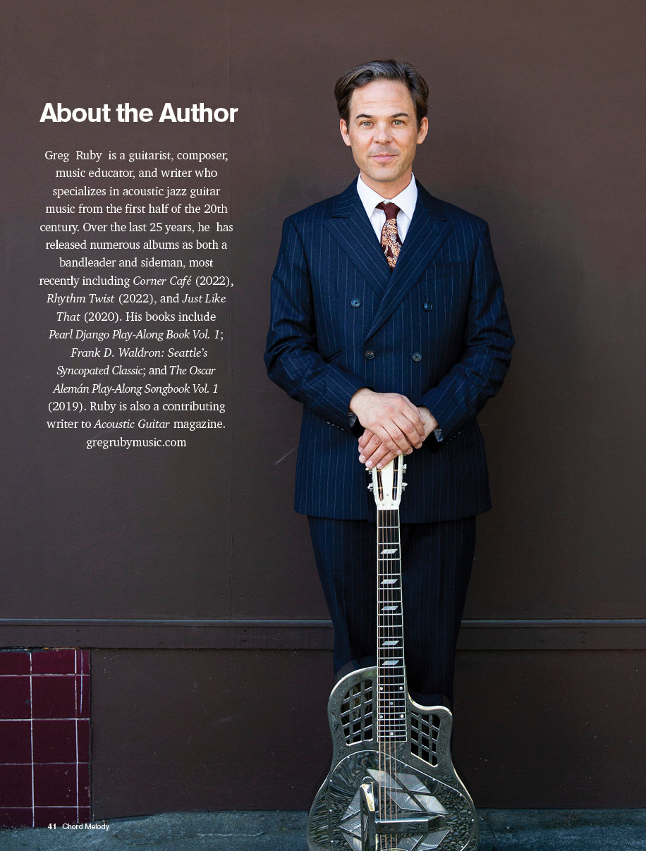 Throughout the guide, we will explore jazz standards such as "Whispering," "Careless Love," "I’ll See You in My Dreams," "After You’ve Gone," and "My Melancholy Baby." We’ll also cover a variety of musical contexts and techniques, including passing chords, tremolo, bass runs, and arpeggiated picking, to fill in the gaps.