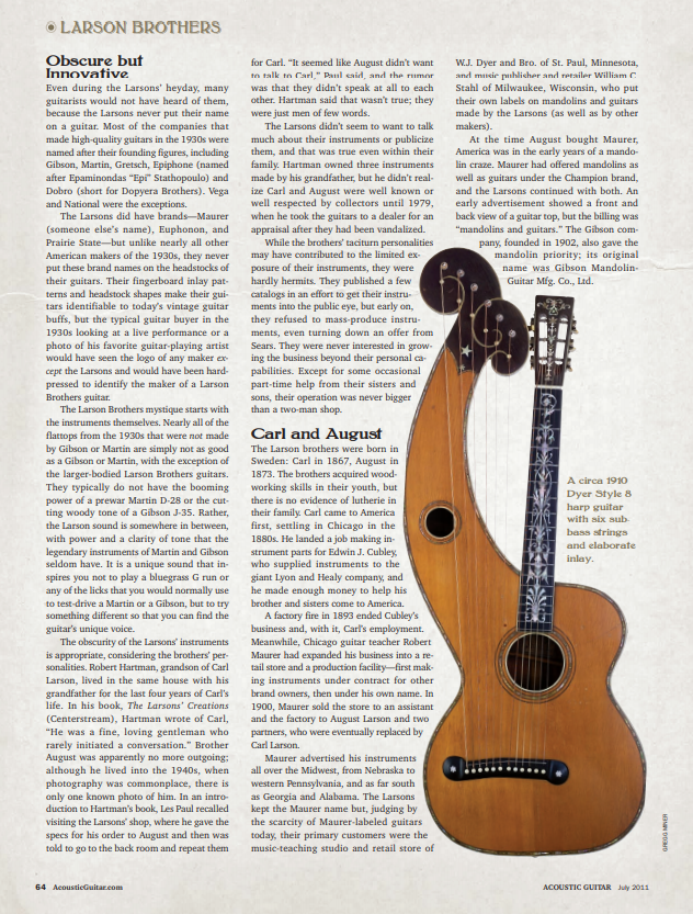 Features: The History of Larson Brothers Instruments. How two Swedish immigrants created some of the most innovative guitars of the early 20th century; Acoustic Preamps. All you need to know about stand-alone acoustic guitar preamps