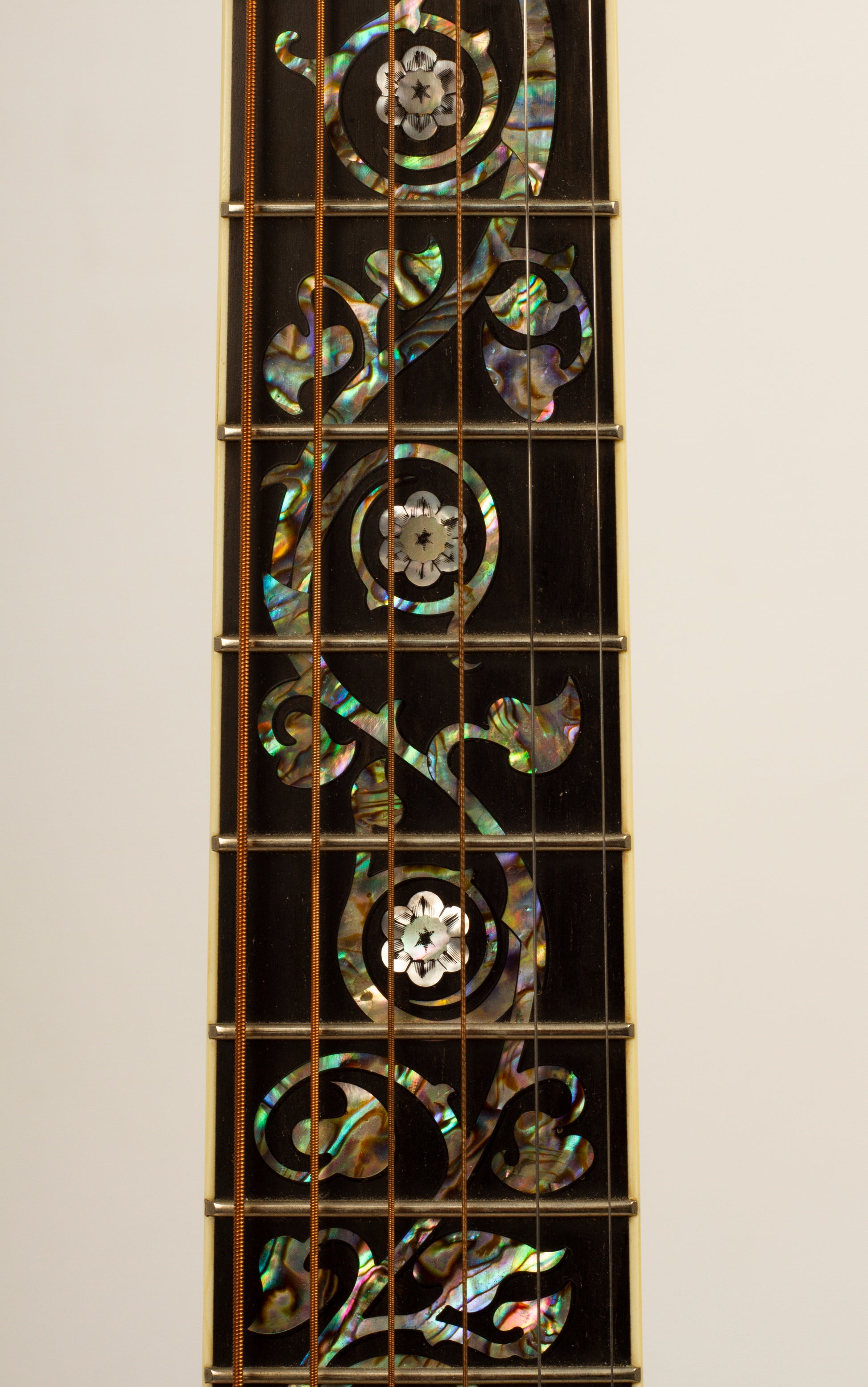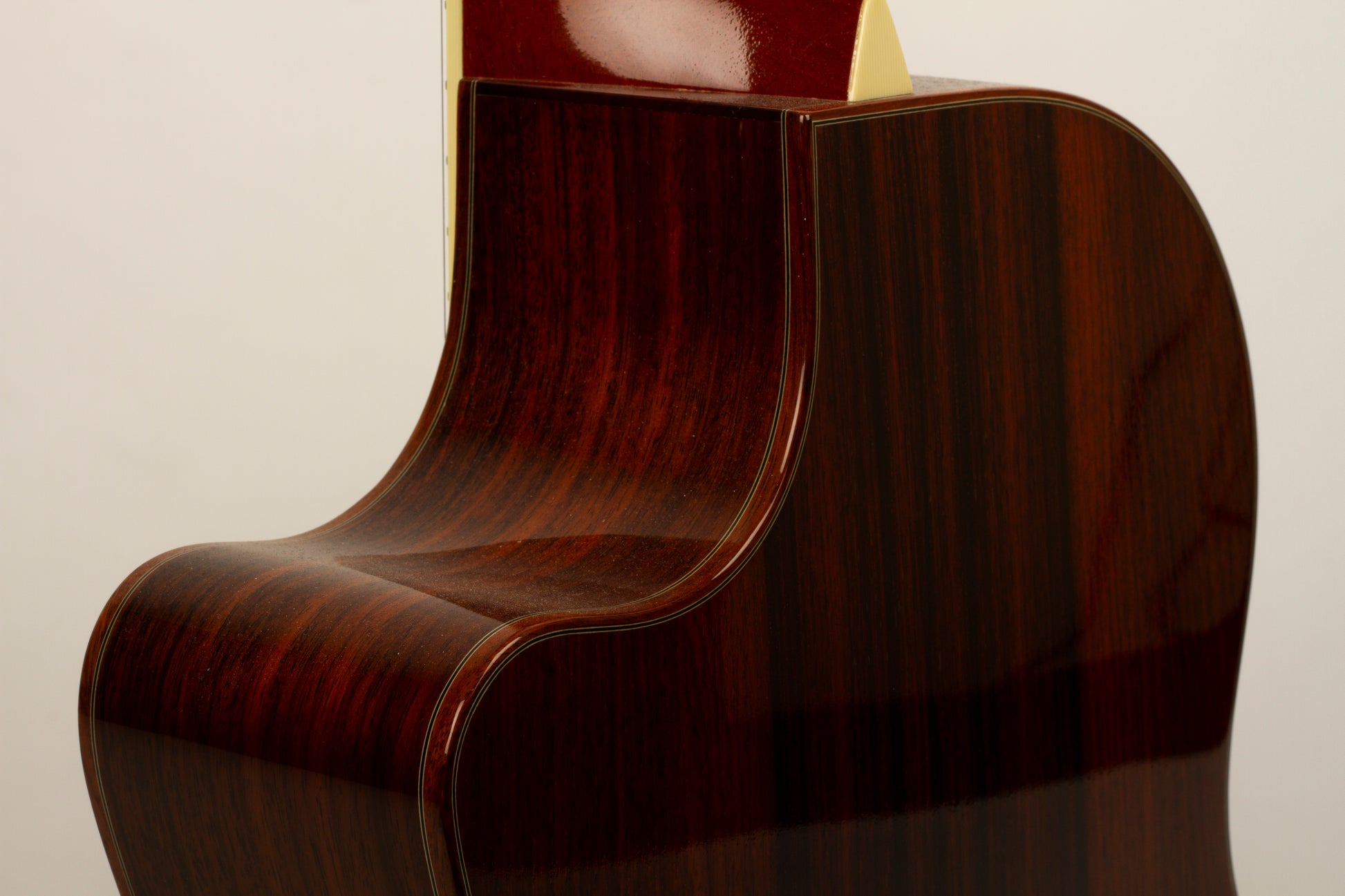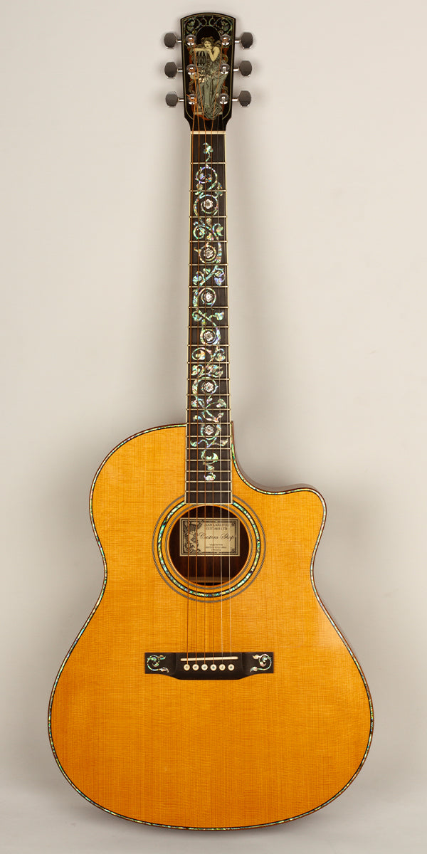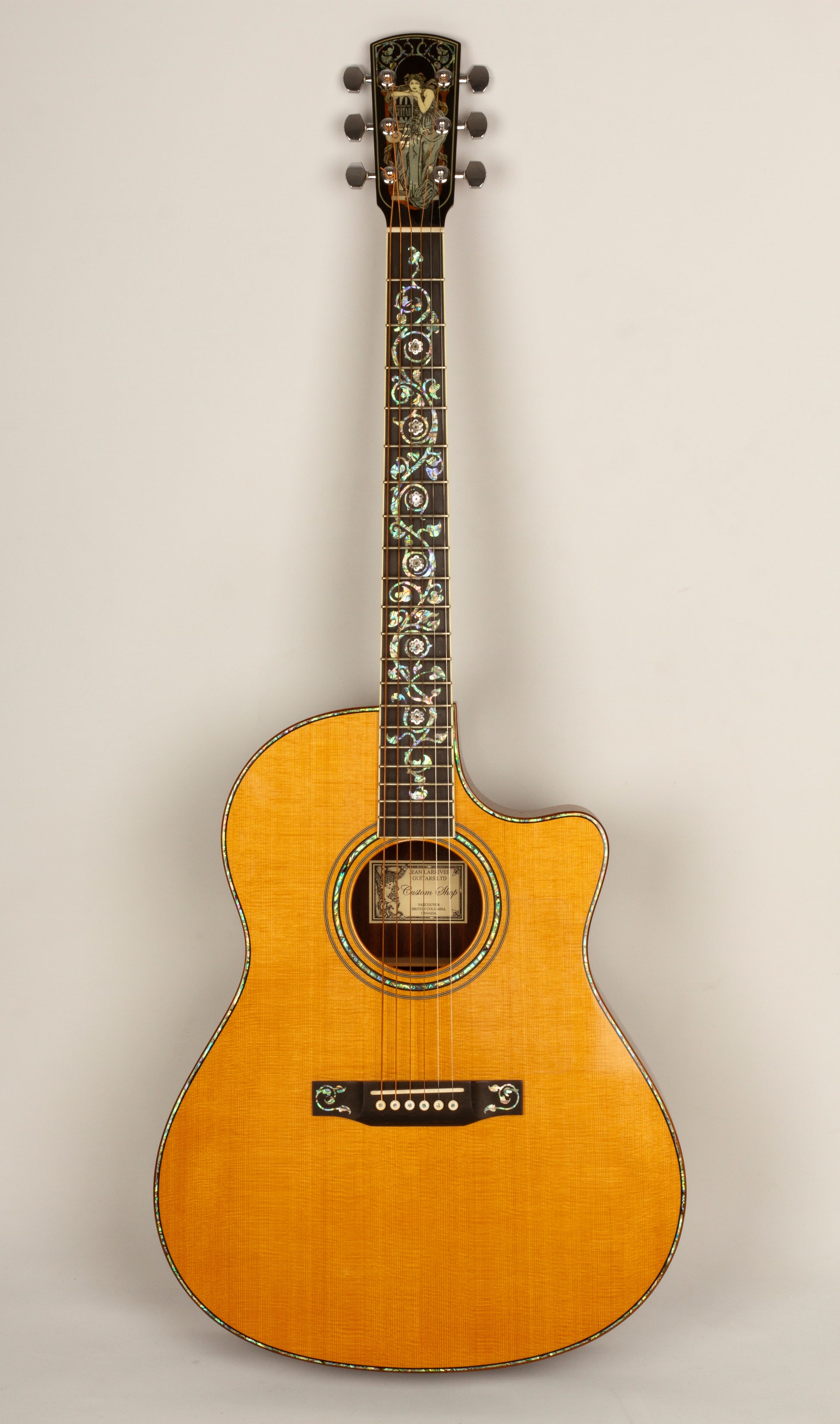 Larrivée’s shiny contribution to the collection is based on their LV-10 model, whose body shape is reminiscent of a classical guitar’s but with larger dimensions. The guitar’s AAA-grade Indian rosewood back and sides are stunning, and the Sitka spruce top—which came from Jean Larrivée’s private stash—has the three-dimensional cross-grain held in high esteem by luthiers and collectors. The instrument features the unique parallel bracing pattern that gives Larrivées their trademark sound and is versatile enough to please flatpickers and fingerstylists alike. The elaborate abalone binding and rosette complement the stunning vine inlays in the bridge and fingerboard, and an entirely original headstock design created by Wendy Larrivée incorporates mother-of- pearl, red abalone, ivory, walnut, and sterling silver wire. “The figure was prepared from drawings of a seated model,” Wendy Larrivée explains, “and those drawings in turn provided the basis for the necessary machining to produce the inlay. The concept for the inlay is totally original, and the resulting headstocks are unmistakably Larrivée yet truly celebratory of Acoustic Guitar magazine’s tenth anniversary.”