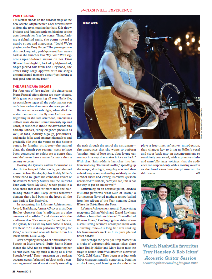 On the Cover: Experience Nashville—Take a trip to Guitar Town and discover the players, places, and cultural touchstones that make it one of the top spots to visit in the U.S., including 6 must-see historic sites; 9 ways to live like a local; why everyone should attend AmericanaFest at least once; hanging off the grid with Music City legend Darrell Scott; and Nathan Bell’s first-person account of what it’s like to try and make it as songwriter.