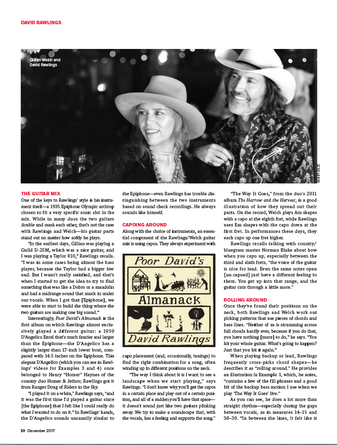 Features: David Rawlings talks about his traditional, but unique guitar work. A roundtable with acoustic music masters Chris Thile, Sarah Jarosz, Chris Eldrige, Aoife O’Donovan, and Julian Lage. A visit with restorer and builder David Eichelbaum. Picking a boutique pick.