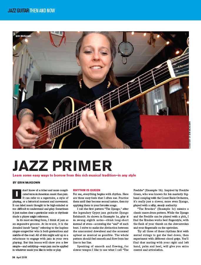 On the Cover: Jazz Guitar, Then & Now special focus includes a feature on a century of the players and instruments of acoustic guitar in jazz; and five modern masters (Mimi Fox, Ron Jackson, Julian Lage, Sean McGowan, Matt Munisteri, Frank Vignola) on ways to embellish rhythm changes.