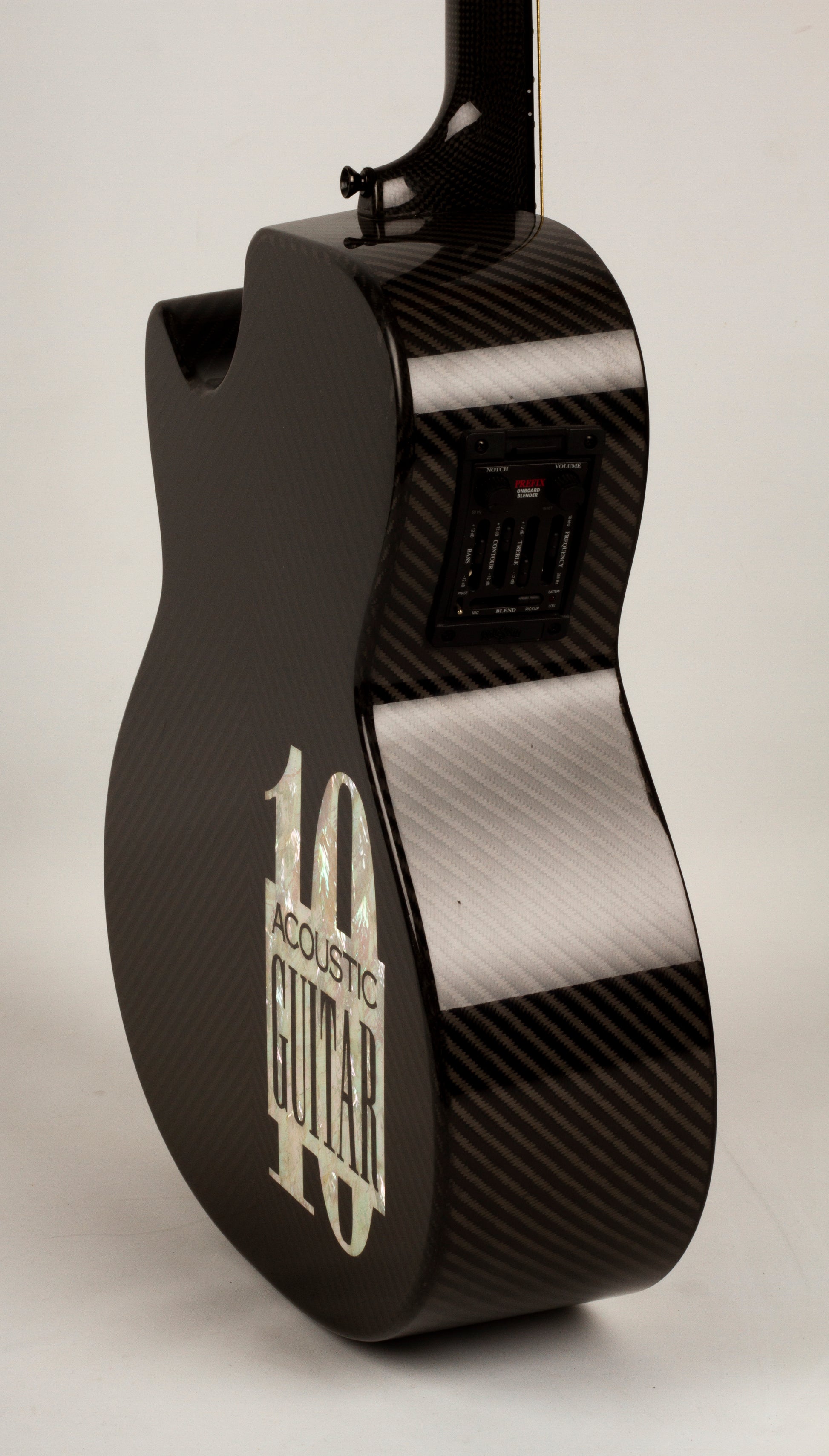 A few more important details: The WS1000 features a deep body with cutaway, chrome Schaller tuners, abalone rosette, raindrop inlays on the fretboard and, on the back, an abalone Acoustic Guitar 10th Anniversary logo beautifully molded into the graphite weave. Top-of-the-line Fishman electronics — an on-board blender system including a piezo pickup, a microphone, and a preamp — deliver a rich amplified sound.