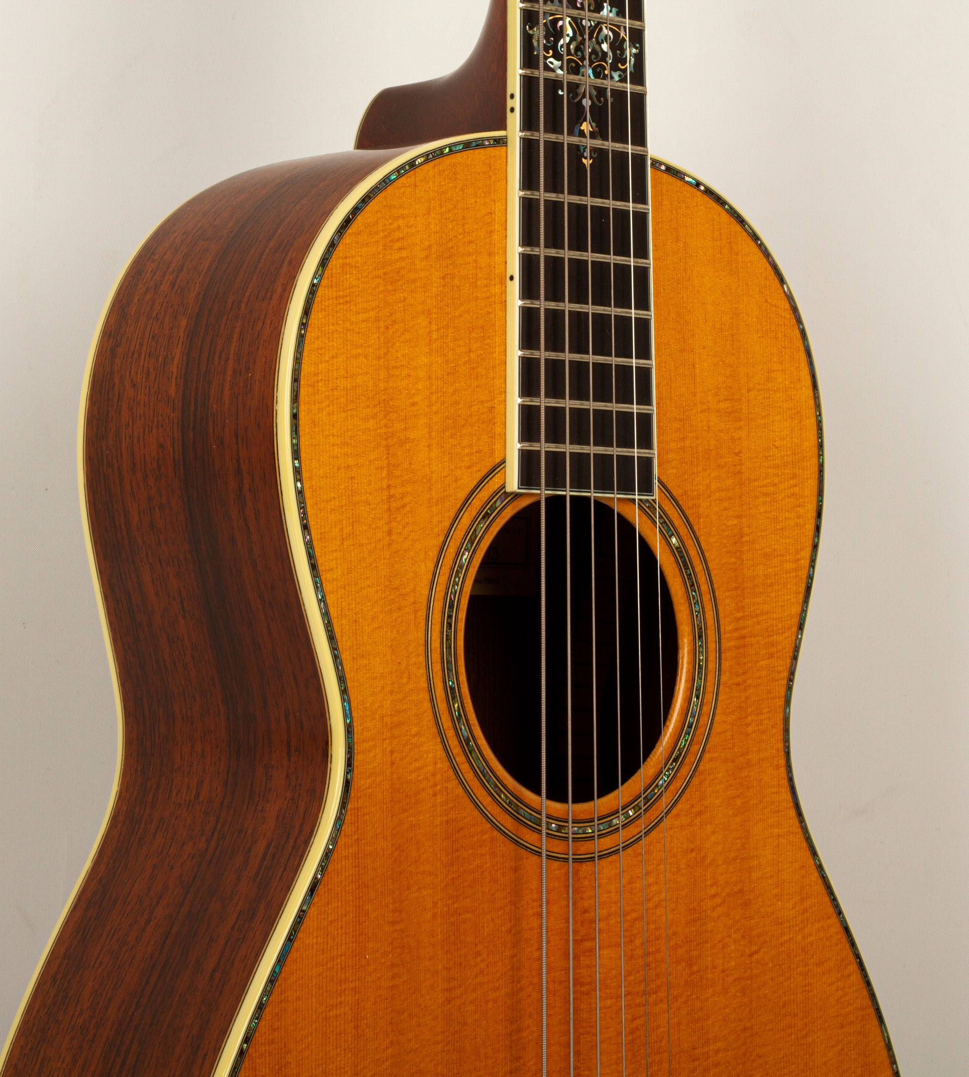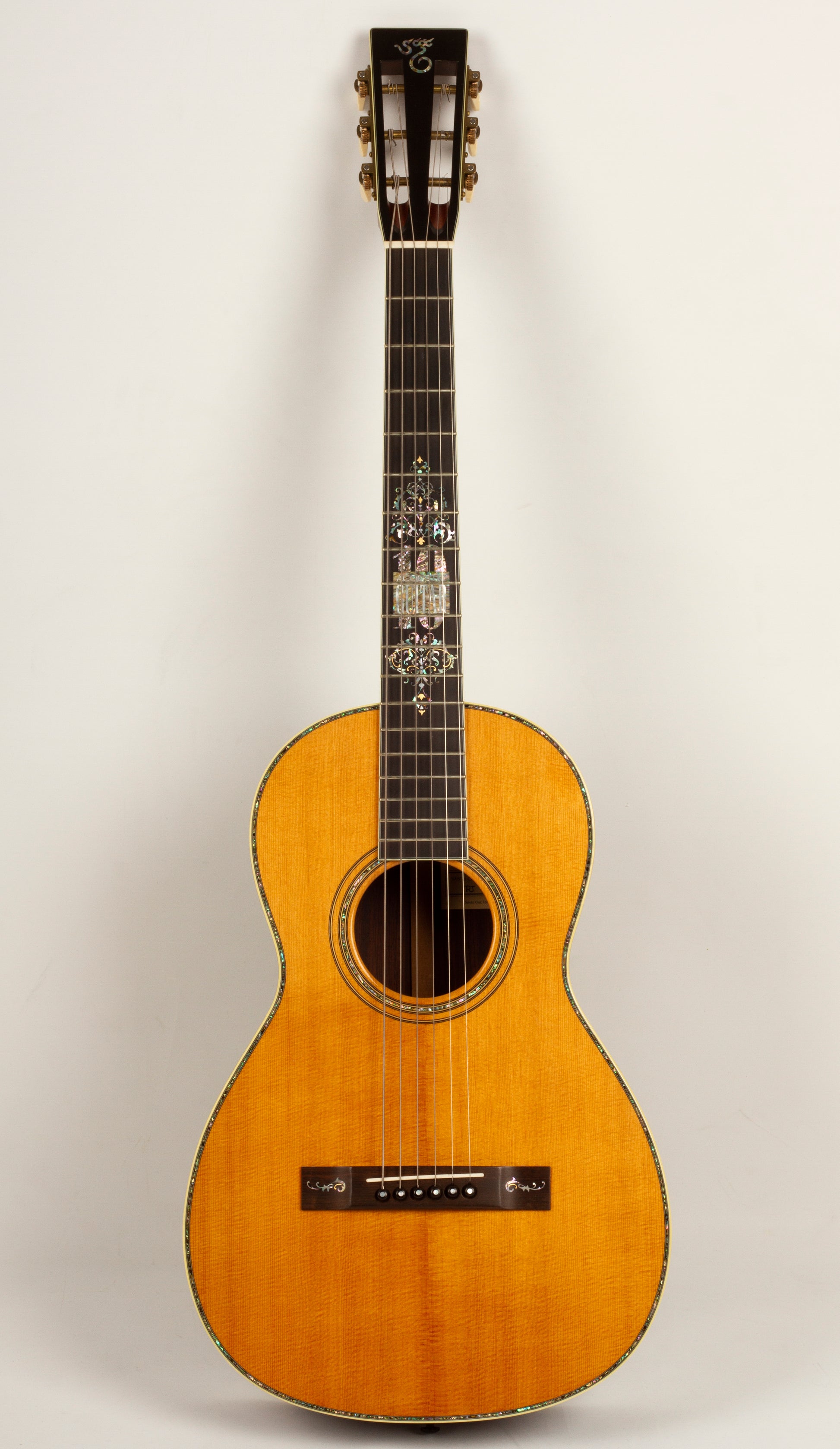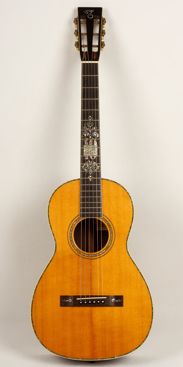 Exemplifying Santa Cruz’s signature craftsmanship, the PJ’s appearance is as elegant as its sound. The highlighted 10th Anniversary logo on the ebony fingerboard is framed by an intricate vine design made of various abalone shells, mother of pearl, and gold. Abalone is repeated in the rosette, top border, and in the bridge feet, where a vine motif matches the design surrounding the Anniversary logo. Other special features include vintage Irving Sloane tuners with ivoroid tuning knobs mounted on a bronze baseplate, and a slotted, unbound headstock with ebony overlay.