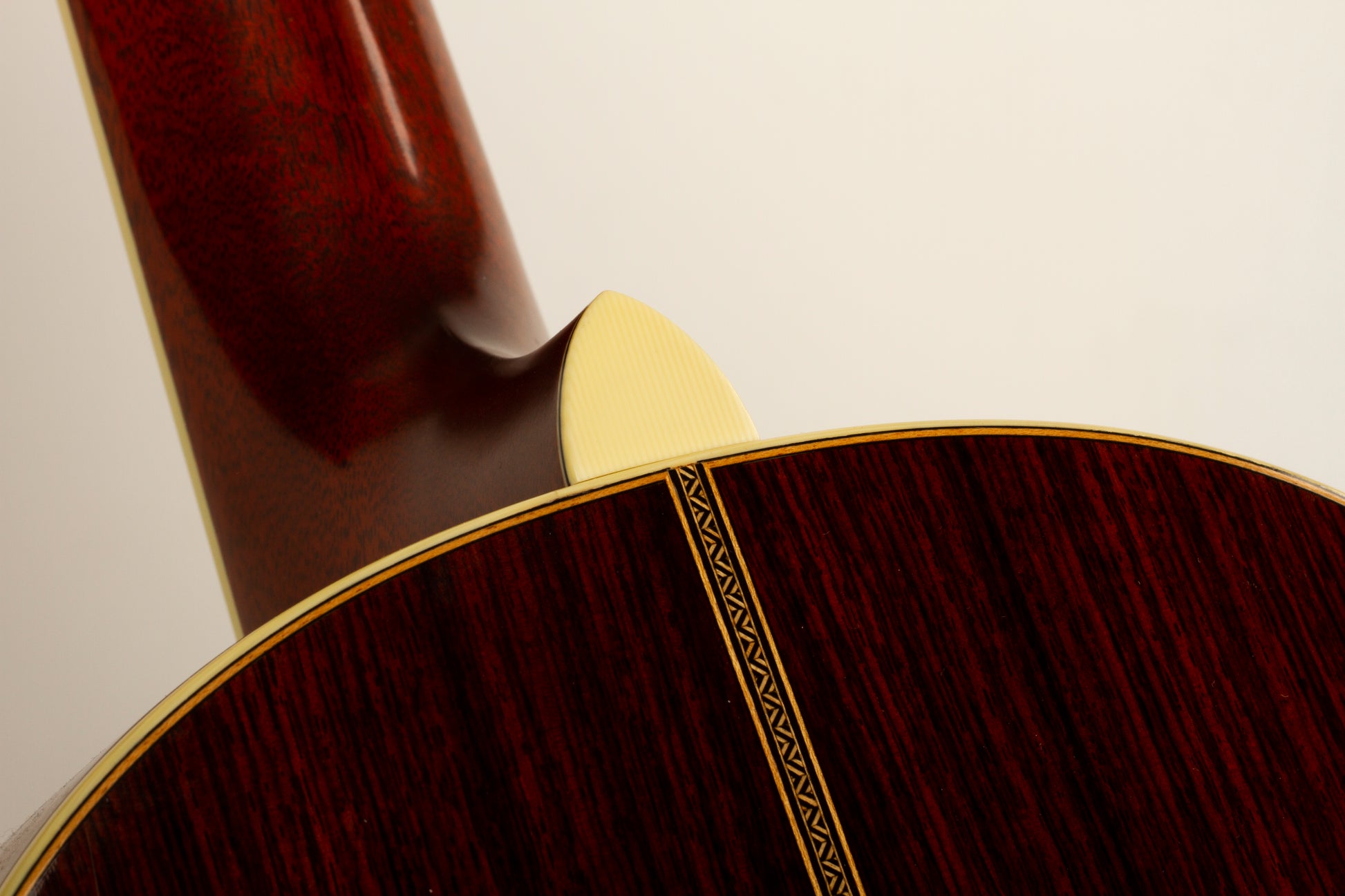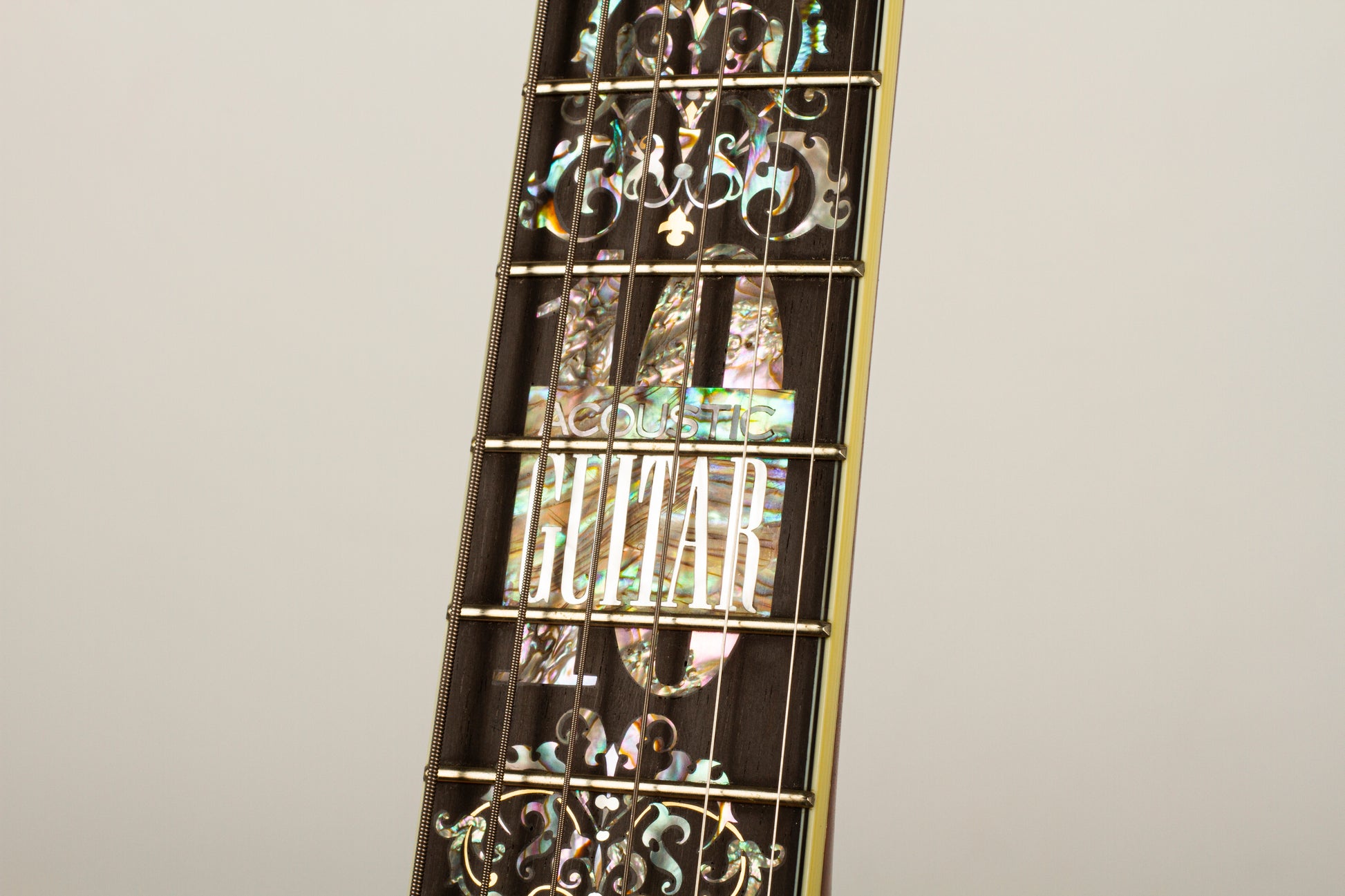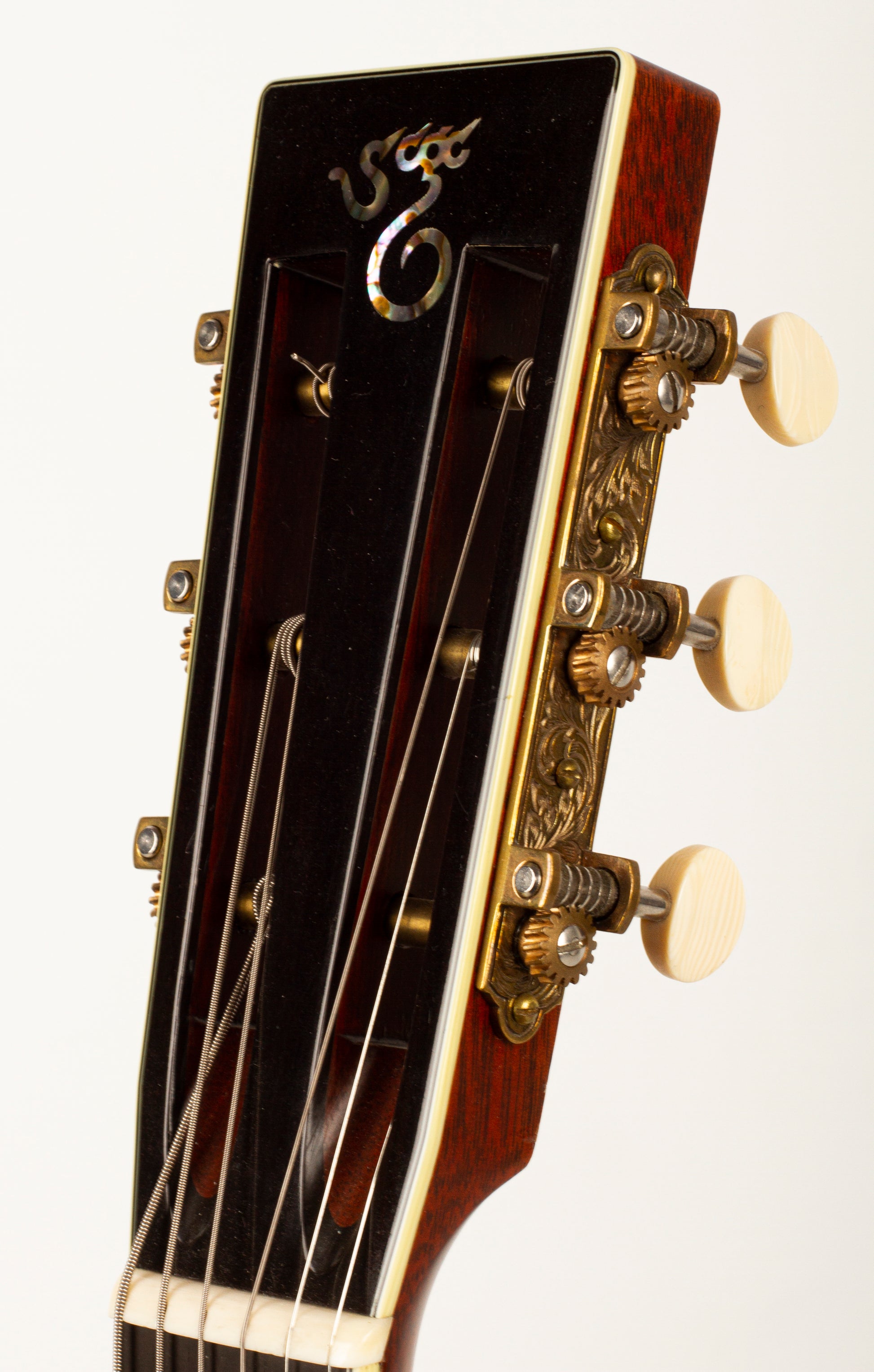Exemplifying Santa Cruz’s signature craftsmanship, the PJ’s appearance is as elegant as its sound. The highlighted 10th Anniversary logo on the ebony fingerboard is framed by an intricate vine design made of various abalone shells, mother of pearl, and gold. Abalone is repeated in the rosette, top border, and in the bridge feet, where a vine motif matches the design surrounding the Anniversary logo. Other special features include vintage Irving Sloane tuners with ivoroid tuning knobs mounted on a bronze baseplate, and a slotted, unbound headstock with ebony overlay.