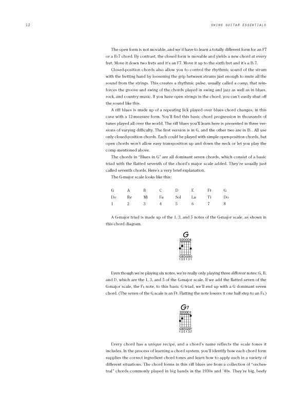 Swing Guitar Essentials shows all examples in both standard notation and tab. The audio tracks are recorded up to tempo and at a slower speed. They're keyed to the lessons, so you can play along, learn at your own pace, and quickly come up to speed. In addition to the examples and exercises there are five complete songs to learn, including "Avalon" and "Minor Swing."