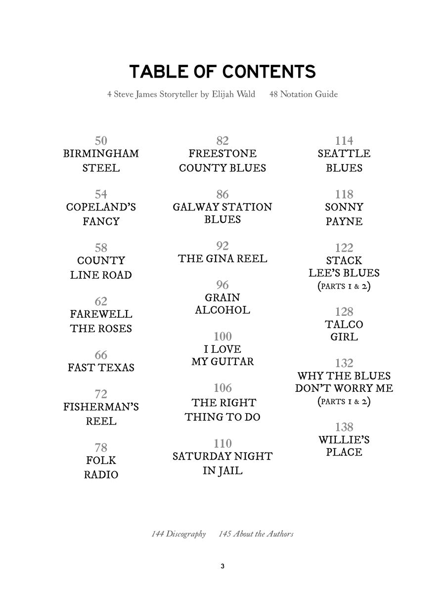 Steve James (1950–2023) was a legendary roots and blues musician, masterful singer-songwriter, and endlessly entertaining storyteller. In this book, you’ll get to know Steve and his music—through his own words and those of longtime collaborators Del Rey and Elijah Wald. This songbook includes full guitar parts in standard notation and tablature, with lyrics, plus the stories behind 20 of Steve’s original songs: